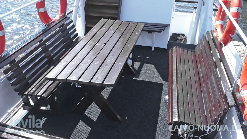 Laive įrengta jauki kajutė, viršutiniai deniai atviri.
