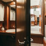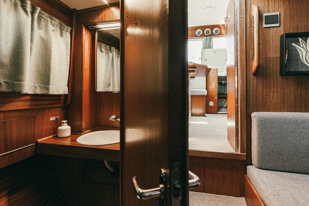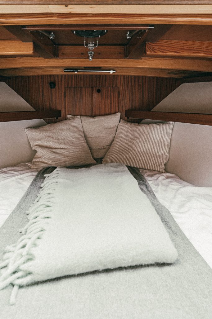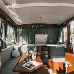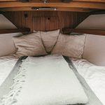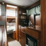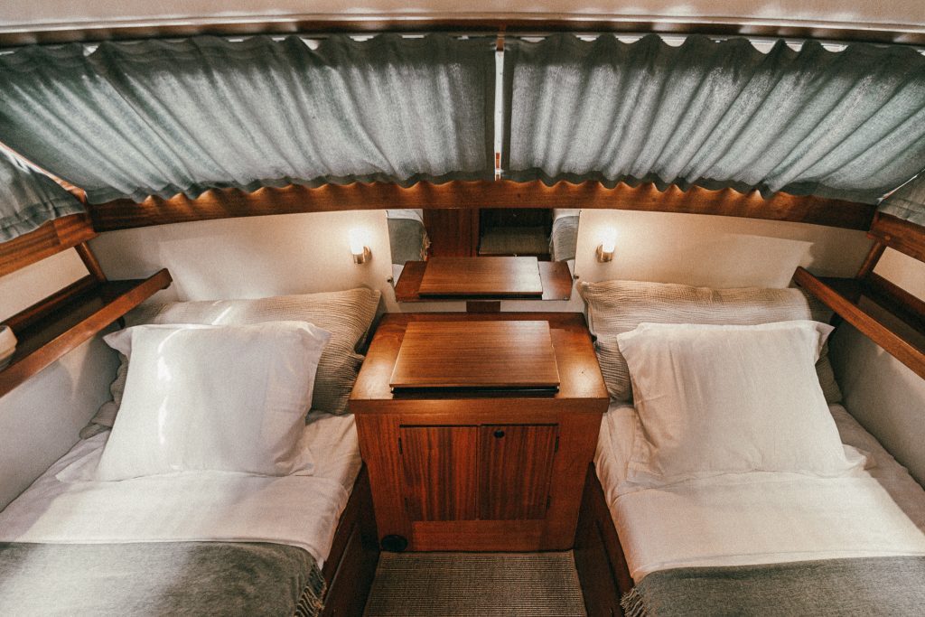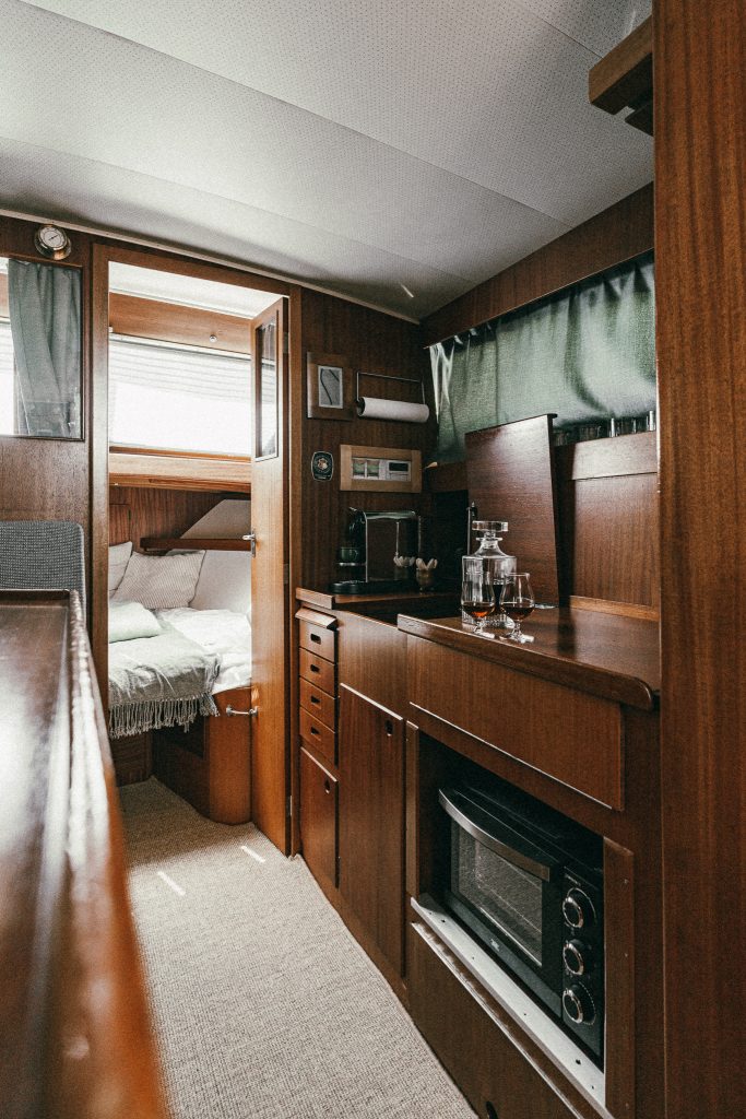 Prabangiame laive įrengti reikalingi patogumai: jaukus šildomas salonas, virtuvė, 2 miegamos kajutės, wc, garso ir vaizdo įranga, kavos aparatas, šaldytuvas ir šaldiklis, indai.