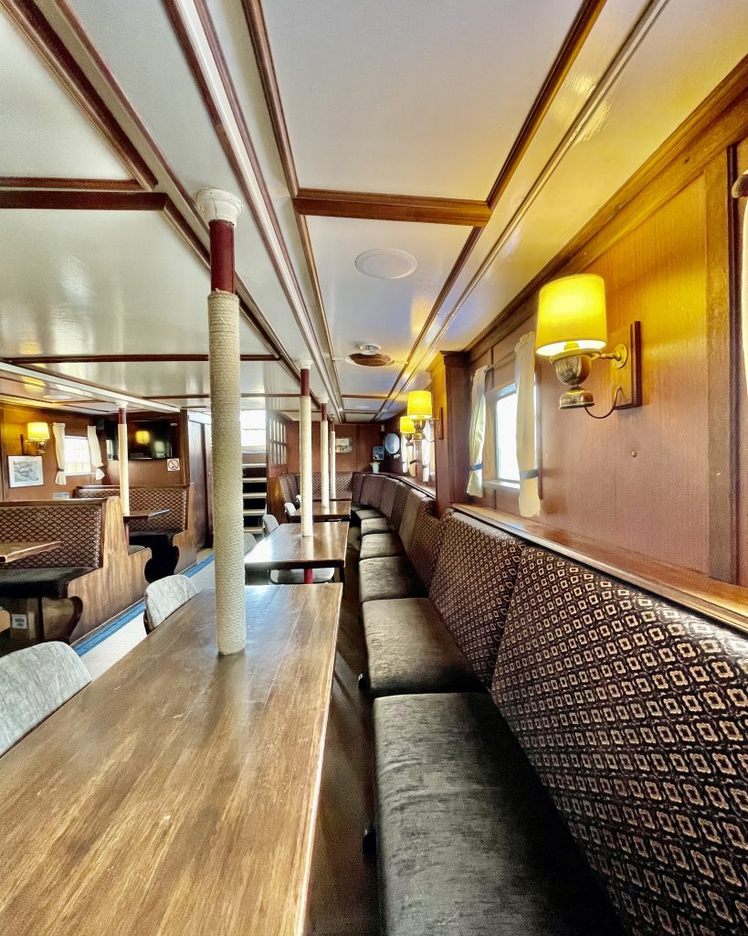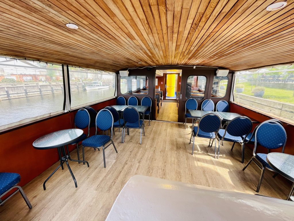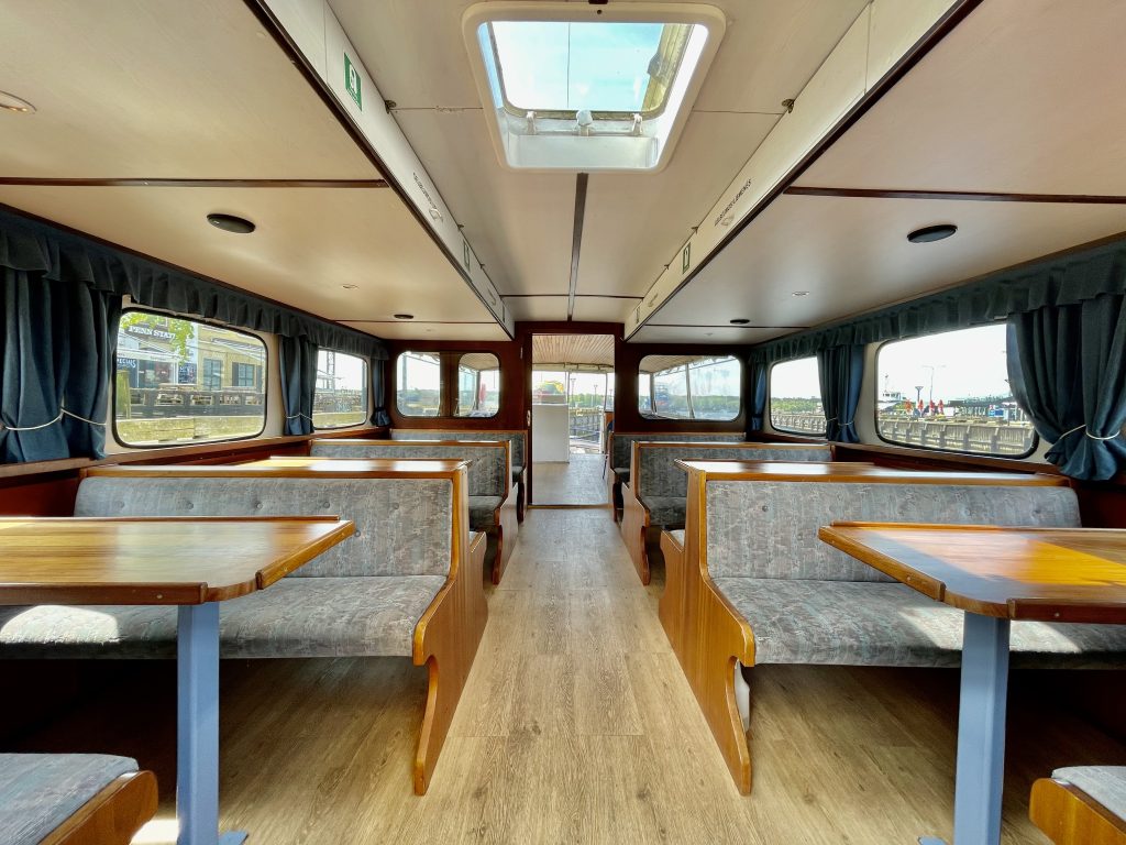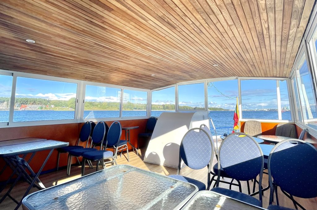 Laivo salonai yra šildomi – laivas tinkamas renginiui laive net ir šaltuoju sezono metu.
