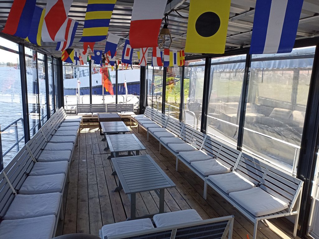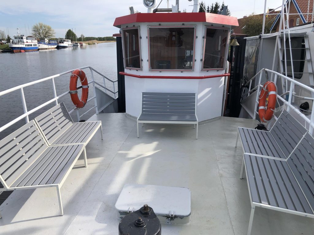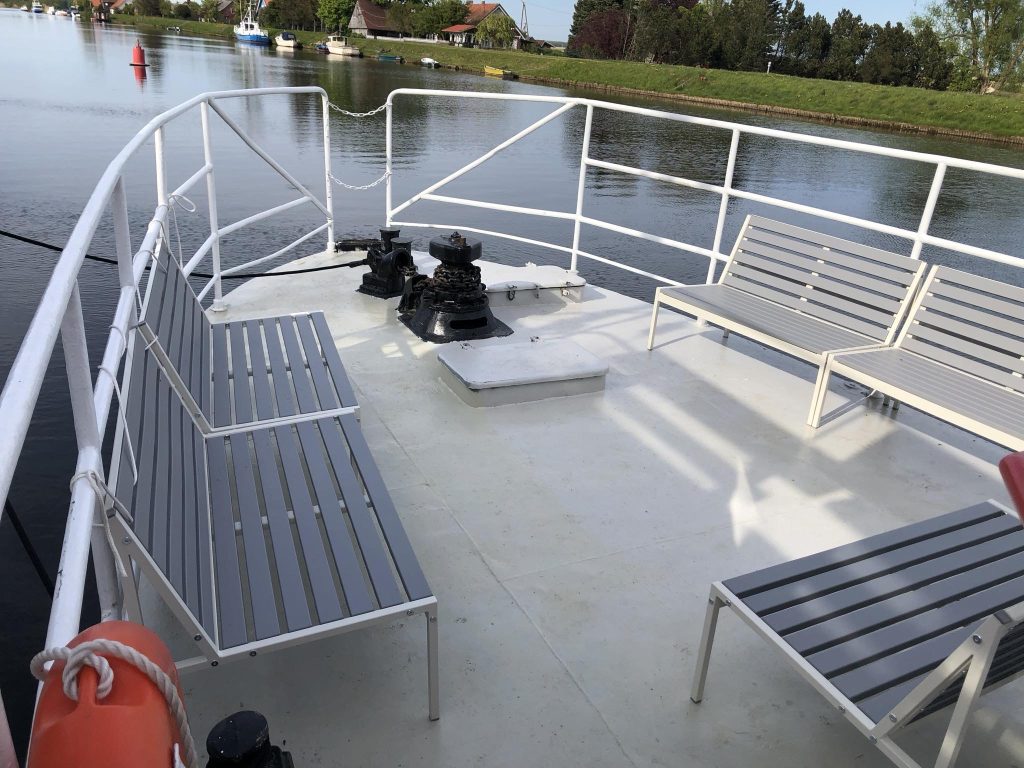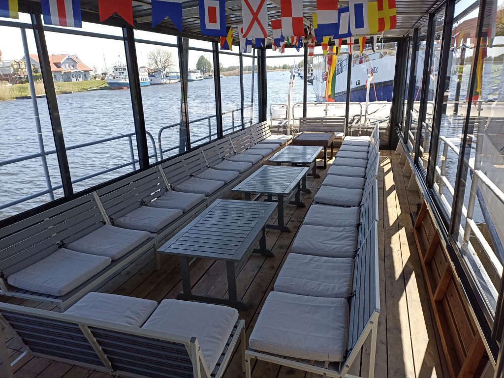 Laivo denis atnaujintas, dengtas stikline terasa – taigi jausitės patogiai ir jaukiai bet kokiomis oro sąlygomis. Erdviame denyje sumontuota garso aparatūra, įrengtos patogios kėdės, didelis stalas, mini baras.